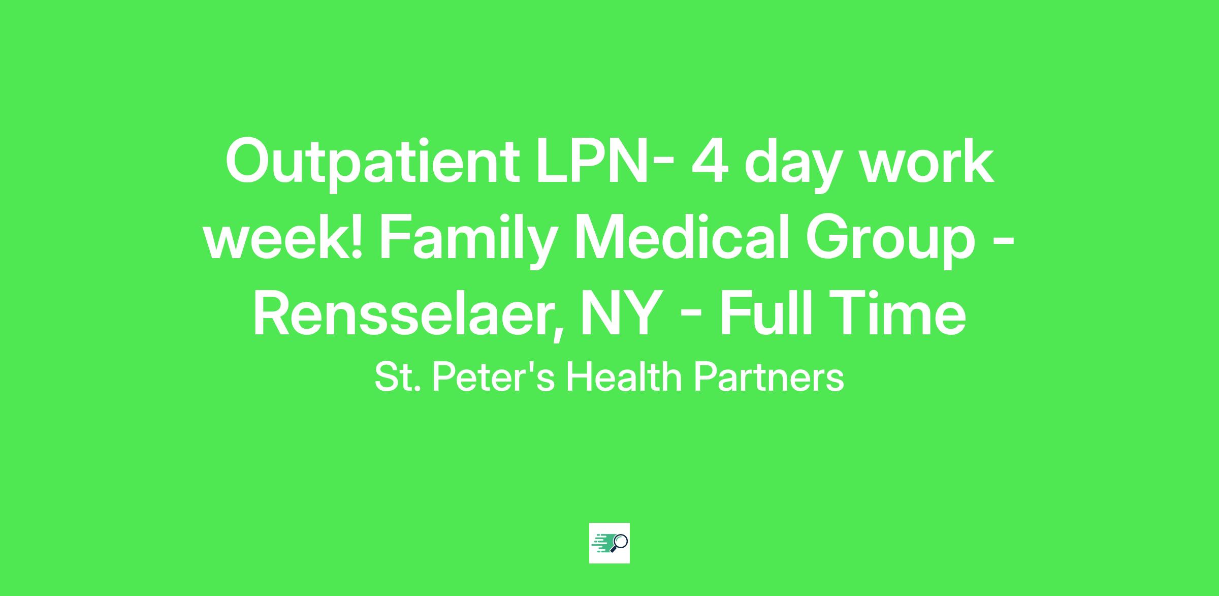 *Employment Type:* Full time *Shift:* *Description:* LPN – Family Medical Group 7-5:30 - Four 10 hr days If you are looking for an LPN position, full time, this could be your opportunity. Here at St. Peter's Health Partner's, we care for more people in more places. This position is located at 279 Troy Road, Rensselaer, NY Position Highlights: Quality of Life: Where career opportunities and quality of life converge Advancement: Strong orientation program, generous tuition allowance and career development Work/Life: Monday - Friday office hours What you will do: * The LPN administers nursing care to patients under the direction of a Registered Professional. * Assists with treatments and procedures and carries out selected duties within the framework of the established nursing plan of care. * Complies with established nursing policies, procedures and standards to provide safe, quality care to patients. Responsibilities: * Consistently takes accurate vital signs. * Accurately collects routine patient data per protocols and/or as directed by the clinical supervisor. * Consistently recognizes high-risk situations and reports them appropriately. * Confers with the clinical supervisor routinely concerning the plan of care. * Makes suggestions as to referrals to other disciplines. * Fulfills protocols or clinical guidelines in establishing workflow priorities. * Consistently demonstrates acceptable technical skills in providing care. * Consistently follows standards of care, established protocols, or clinical guidelines in providing patient care. * Consistently follows infection control policies in administering care. * Consistently provides patient care in consideration of age related requirements. * Consistently reinforces patient and family teaching. * Administers medications safely in accordance with relevant unit policies and procedures. * Demonstrates ability to accurately transcribe physician orders. * Demonstrates a working knowledge of computer skills relevant to the care area. * Demonstrates initiative and flexibility with assignments. * Functions as a team member in carrying out assignments. What you will need: * A current license to practice as a Practical Nurse in the State of New York * Graduate of accredited school of Practical Nursing. * High School diploma / GED required * Must be able to lift 20 lbs Pay Range: $23.85 - $29.95 Pay is based on experience, skills, and education. Exempt positions under the Fair Labor Standards Act (FLSA) will be paid within the base salary equivalent of the stated hourly rates. The pay range may also vary within the stated range based on location. *Our Commitment * Rooted in our Mission and Core Values, we honor the dignity of every person and recognize the unique perspectives, experiences, and talents each colleague brings. By finding common ground and embracing our differences, we grow stronger together and deliver more compassionate, person-centered care. We are an Equal Opportunity Employer. All qualified applicants will receive consideration for employment without regard to race, color, religion, sex, sexual orientation, gender identity, national origin, disability, veteran status, or any other status protected by federal, state, or local law.