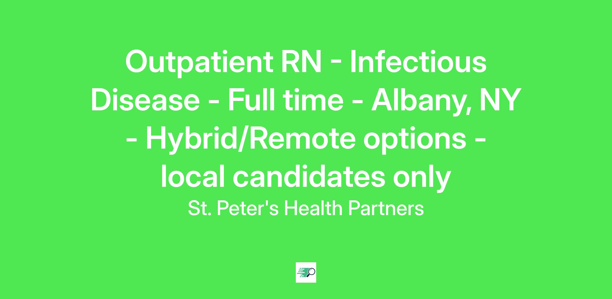 *Employment Type:* Full time *Shift:* Day Shift *Description:* RN - Infectious Disease Office- Hybrid/remote options - FT/DAY - Albany If you are looking for an RNII position in an Infectious Disease Office, this could be your opportunity. Here at St. Peter's Health Partner's, we care for more people in more places. This position is located at 404 New Scotland Ave, Albany NY. Position Highlights: Quality of Life: Where career opportunities and quality of life converge Advancement: Strong orientation program, generous tuition allowance and career development Work/Life: Monday – Friday Office Hours What you will do: The Registered Professional Nurse has the responsibility and accountability to utilize the nursing process to diagnose and treat human responses to actual or potential problems of individuals or groups. The Registered Professional Nurse works within and contributes to an environment where the St. Peter's Healthcare Services mission is actualized, patient outcomes are achieved, and professional practice is realized. Responsibilities: Brings patient to exam room, takes appropriate vital signs and documents in electronic medical record. Review and update medication list to ensure accurate and complete list in electronic medical record (EMR) available for provider review and submission. Complete referrals and tracks patients' compliance. Review prescriptions electronically and send prescriptions to providers for review and submission. Obtains patient consent for procedures as directed by provider. Performs pre-visit planning and reviews quality metrics. Retrieves telephonic clinical information from patients who call into the office. Monitors task list and completes tasks assigned by provider in a timely manner based on urgency. Educates patients regarding medication, testing procedures and home care techniques. Ensure proper labeling, handling and documentation for patient specimens. Follow up with patient regarding test results based on advice given by provider. Maintains a clean and safe work environment including disinfecting patient care areas and equipment. In conjunction with other nursing colleagues, maintains the medical supply cabinet and drug cabinet. Uses the electronic medical record to communicate effectively. Performs quality assurance duties as assigned. Provides a clinical visit summary (Patient Plan) to patient as requested including educational materials. Participates in daily Patient Care huddles as appropriate. Works cooperatively with all colleagues to ensure quality patient care at all times. Performs other duties as assigned. What you will need: Associates or Bachelor’s degree in Nursing preferred HS Diploma/equivalent required Current unencumbered NYS RN license Basic Life Support certification 6 months previous RN experience Must be able to lift 20 lbs. Pay Range: $30.00 - $43.50 Pay is based on experience, skills, and education. Exempt positions under the Fair Labor Standards Act (FLSA) will be paid within the base salary equivalent of the stated hourly rates. The pay range may also vary within the stated range based on location. *Our Commitment * Rooted in our Mission and Core Values, we honor the dignity of every person and recognize the unique perspectives, experiences, and talents each colleague brings. By finding common ground and embracing our differences, we grow stronger together and deliver more compassionate, person-centered care. We are an Equal Opportunity Employer. All qualified applicants will receive consideration for employment without regard to race, color, religion, sex, sexual orientation, gender identity, national origin, disability, veteran status, or any other status protected by federal, state, or local law.