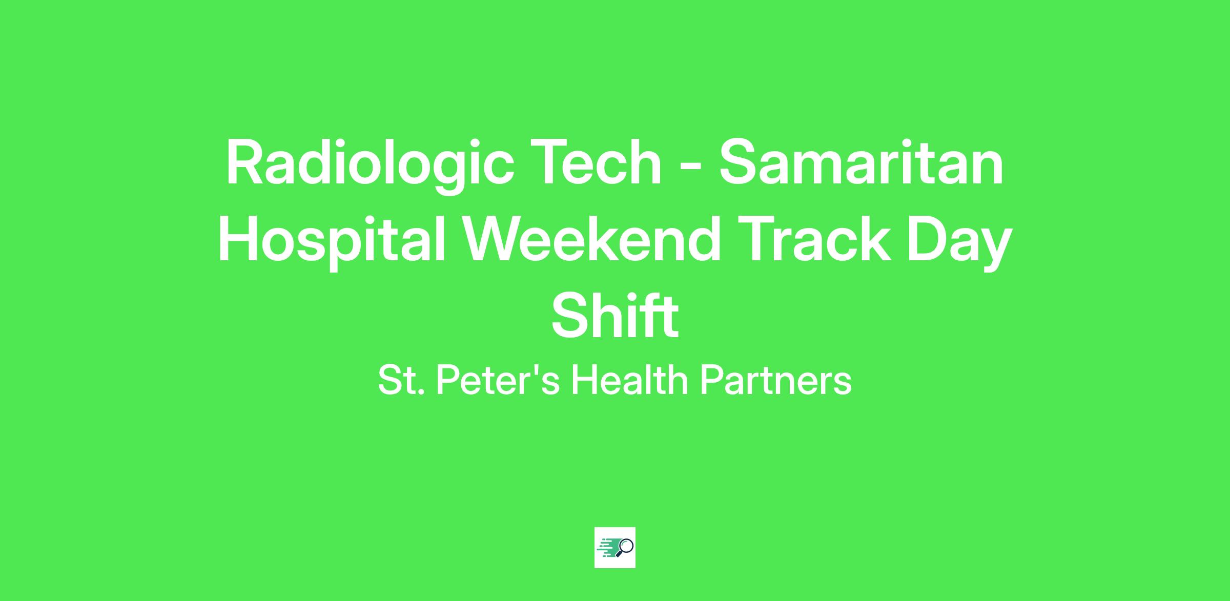 *Employment Type:* Full time *Shift:* Day Shift *Description:* Radiologic Technologist - Samaritan Hospital Weekend Track: 12 hours Day Shift If you are looking for a weekend track day shift position with an amazing Medical Imaging team, this could be your opportunity. Here at Samaritan Hospital, an affiliate of St. Peter's Health Partners, we care for more people in more places. *Position Highlights:* * Quality of Life: Where career opportunities and quality of life converge * Advancement: Strong orientation program, generous tuition allowance and career development *What you will do:* The Radiologic Technologist is responsible to perform diagnostic radiographic, CT, MRI or US examinations in accordance with departmental standards. The incumbent interacts with physicians, staff and others in the efficient and service oriented operation and performs all job functions in a courteous and professional manner consistent with our mission and goals. *Responsibilities:* * Diagnostic imaging * Operate and adjust imaging equipment * Explain procedure to patient, position patient and equipment *What you will need:* * AAS Degree in Radiologic Technology or Equivalent * Current ARRT registration and NYS license required or Eligible *Pay Range:* $31.50 - $45.90 *Weekend Track Rate: *$43.00 Pay is based on experience, skills, and education. Exempt positions under the Fair Labor Standards Act (FLSA) will be paid within the base salary equivalent of the stated hourly rates. The pay range may also vary within the stated range based on location. *Our Commitment * Rooted in our Mission and Core Values, we honor the dignity of every person and recognize the unique perspectives, experiences, and talents each colleague brings. By finding common ground and embracing our differences, we grow stronger together and deliver more compassionate, person-centered care. We are an Equal Opportunity Employer. All qualified applicants will receive consideration for employment without regard to race, color, religion, sex, sexual orientation, gender identity, national origin, disability, veteran status, or any other status protected by federal, state, or local law.