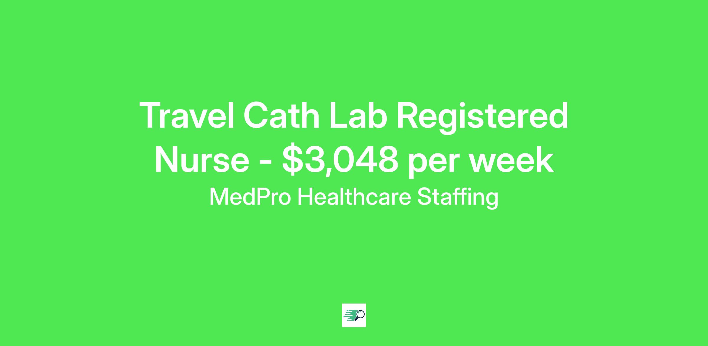 MedPro Job ID . Pay package is based on 8 hour shifts and 40 hours per week (subject to confirmation) with tax-free stipend amount to be determined. Posted job title: Cath Lab Registered Nurse Nursing: Cath Lab Nurse (Diagnostic).